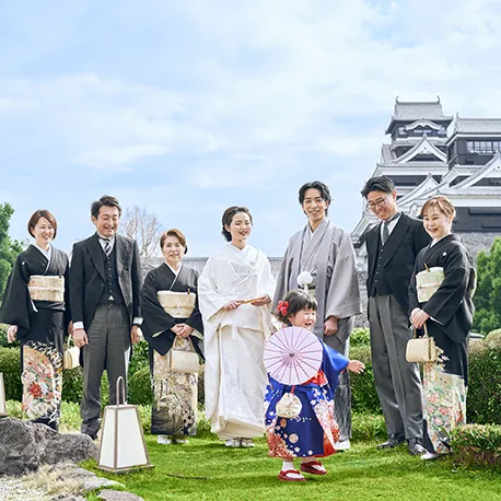 熊本城を望む庭園での人前式。和婚のパーティースタイルで幸せな時間をお過ごしいただけます。専属ウエディングプランナーがサポートします。